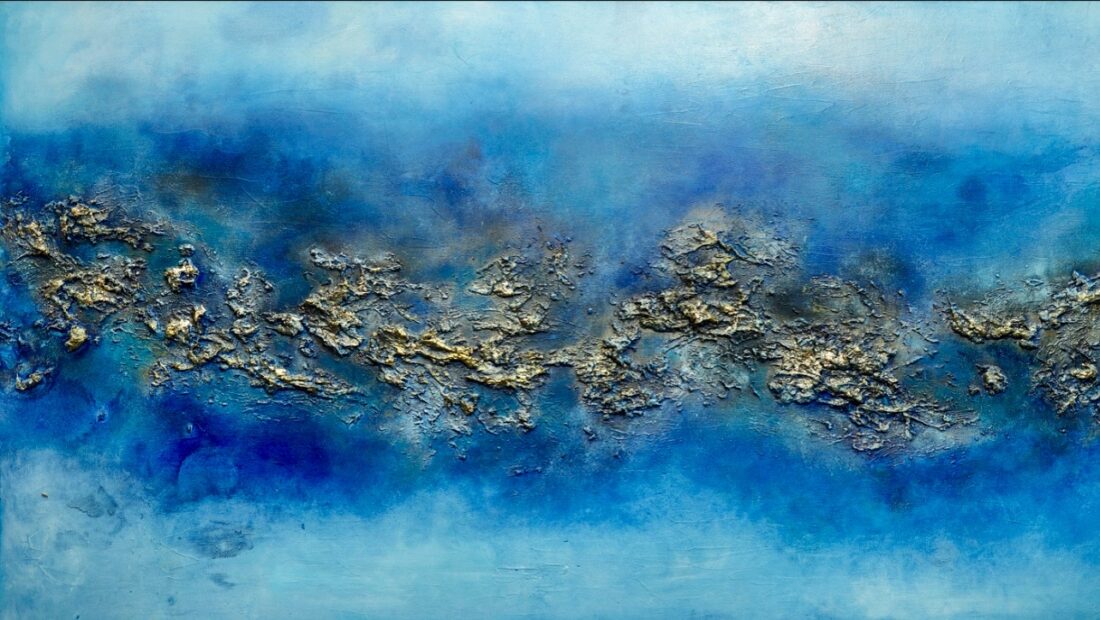 “Cordillera Dorada: Horizontes Celestiales” es una obra abstracta de arte que presenta una cordillera de formas rocosas en el centro de la composición, rodeada por tonos azules que se difuminan con blancos y se realzan con reflejos dorados. Las formas rocosas, que alcanzan una altura impresionante, están enriquecidas con detalles dorados que resaltan su imponencia. La obra captura la majestuosidad de una cordillera que se eleva hacia el cielo, con los tonos celestiales que se fusionan con la tierra