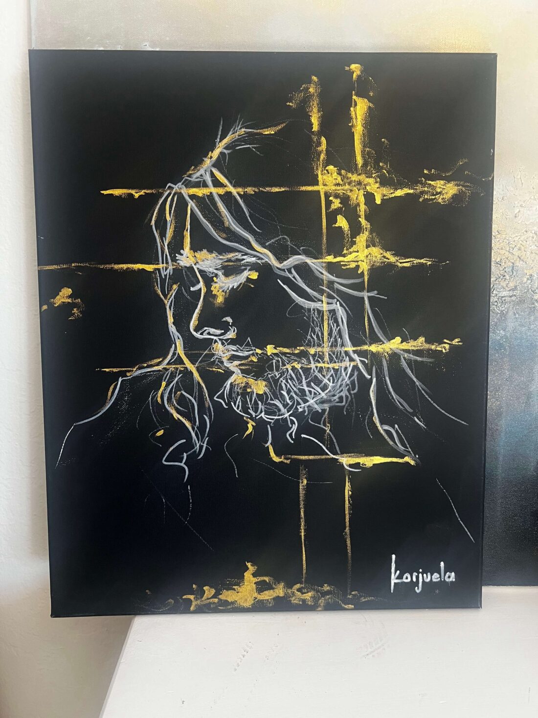 Esta obra captura la esencia espiritual de Jesús a través de un estilo abstracto que combina trazos blancos etéreos y toques de dorado, evocando luz, divinidad y esperanza. El contraste entre el fondo oscuro y los detalles brillantes simboliza la presencia divina iluminando la oscuridad.
